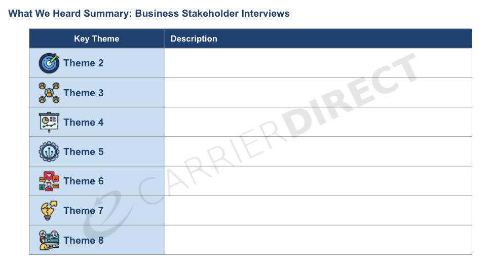 Maybe we’ll discover that your lack of focus on carrier experience is a cause of lost business. Perhaps inconsistent organization structures or roles & responsibilities cause confusion for your employees. Sometimes we uncover fragmented systems, performance issues, or process bottlenecks standing as blockers to reaching your goals.